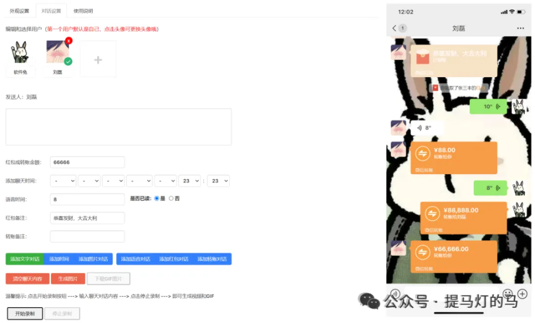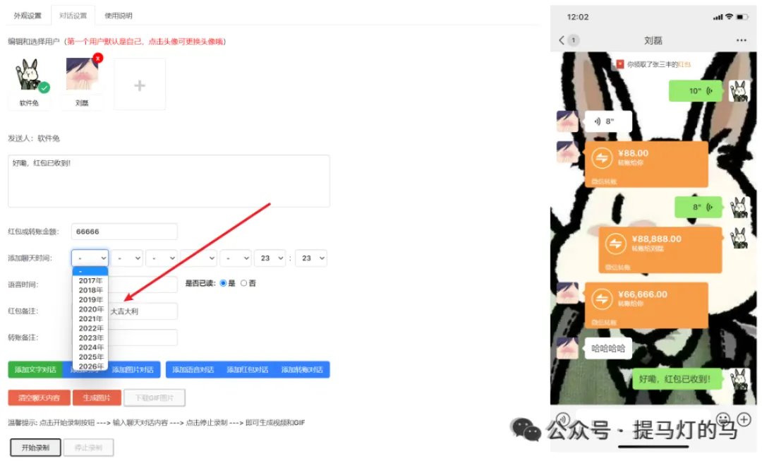 发红包、转账更方便,填好金额、备注,选好已领取或未领取状态,发送时间甚至能调到 2017 年,逼真度拉满。最后点 “生成图片” 就能导出截图,还能录成视频,看着就像真的在手机上聊天一样。