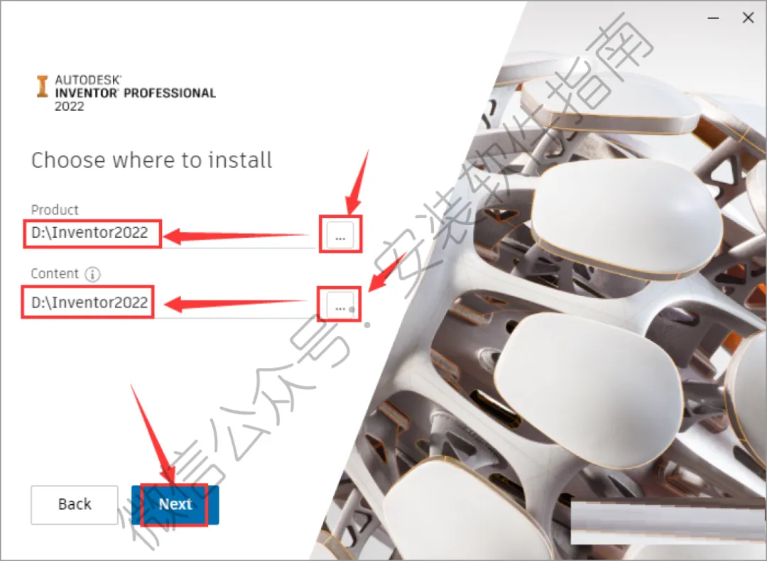 6、点击...选择安装位置,点击 Next。(产品指的是软件本身,内容指的是样板和族库,选择同一个安装位置,安装位置不要含有中文路径)