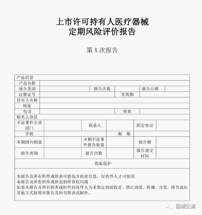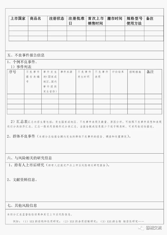2.3.1封面包括产品名称、注册证/备案证批准日期、报告类别(首次注册/延续注册)、报告次数、报告期、本期国内销量、本期境外销量、本期不良事件报告数量,企业名称、联系地址、邮编、传真,负责产品安全的的部门、负责人及联系方式(包括手机、固定电话、电子邮箱等),报告提交时间,以及隐私保护等相关信息(参见附表1)。