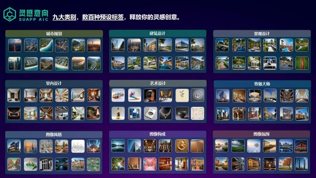 九大类别精准覆盖: 涵盖城市规划、建筑设计、景观设计、室内设计、艺术设计、致敬大师、图像风格、图像构成、图像氛围九大类别,搭配数百种预设标签,精准匹配设计需求;