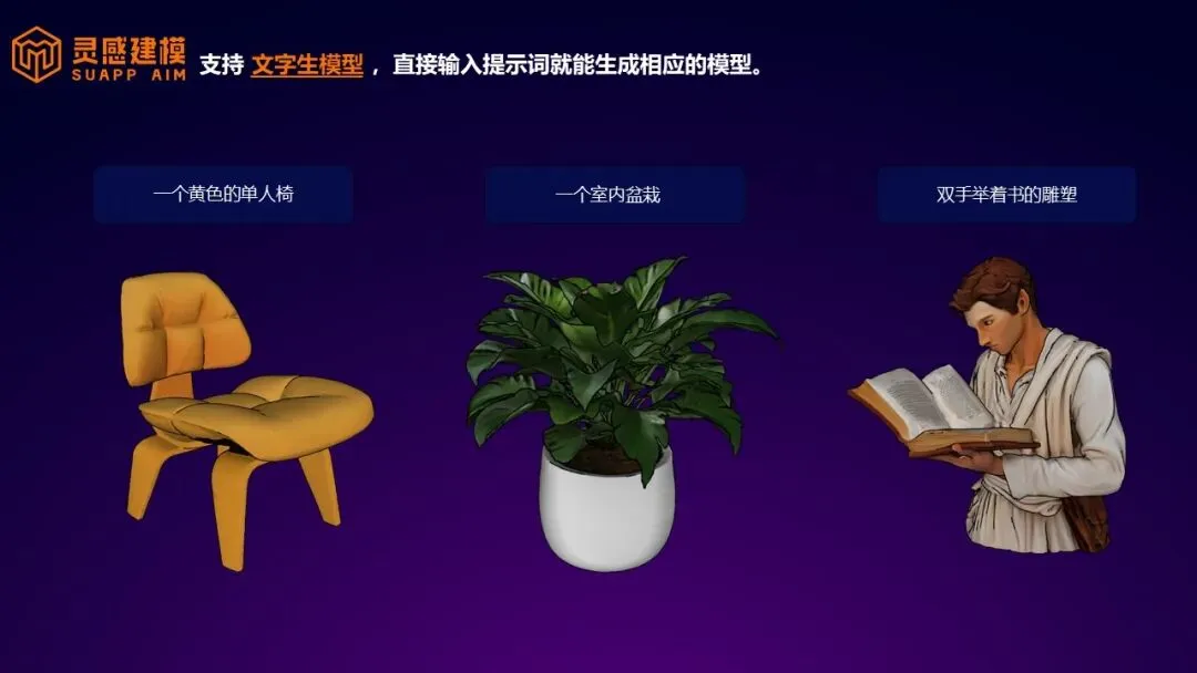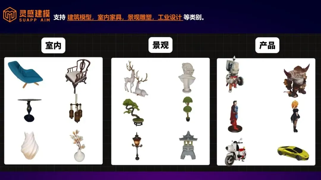 多类别模型覆盖: 支持建筑模型、室内家具、景观雕塑、工业设计等类别,尤其擅长异形模型生成,提升复杂设计效率;