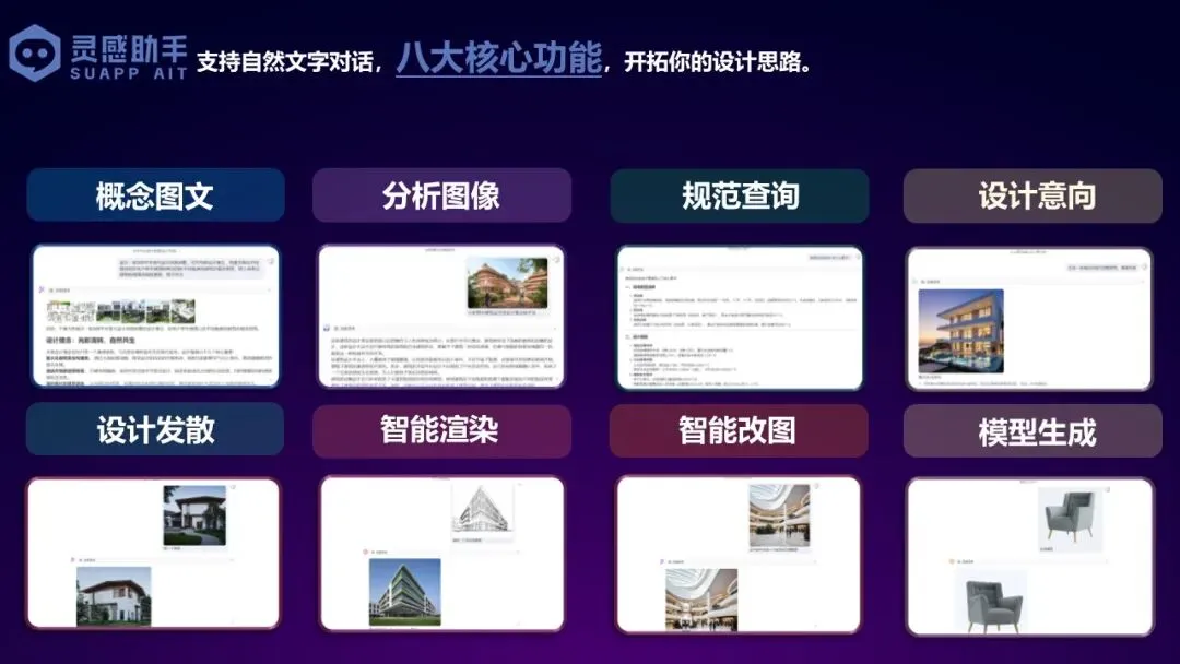 八大核心功能覆盖: 支持概念图文生成、分析图像制作、规范查询、设计意向获取、设计发散、智能渲染、智能改图、模型生成,全方位响应设计需求;
