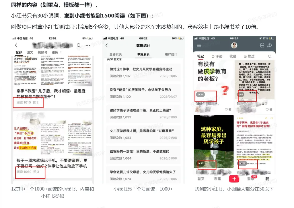 ✅ 效率:获客效率是小红书的10倍(同一条内容,小红书30浏览,小绿书1500+阅读)