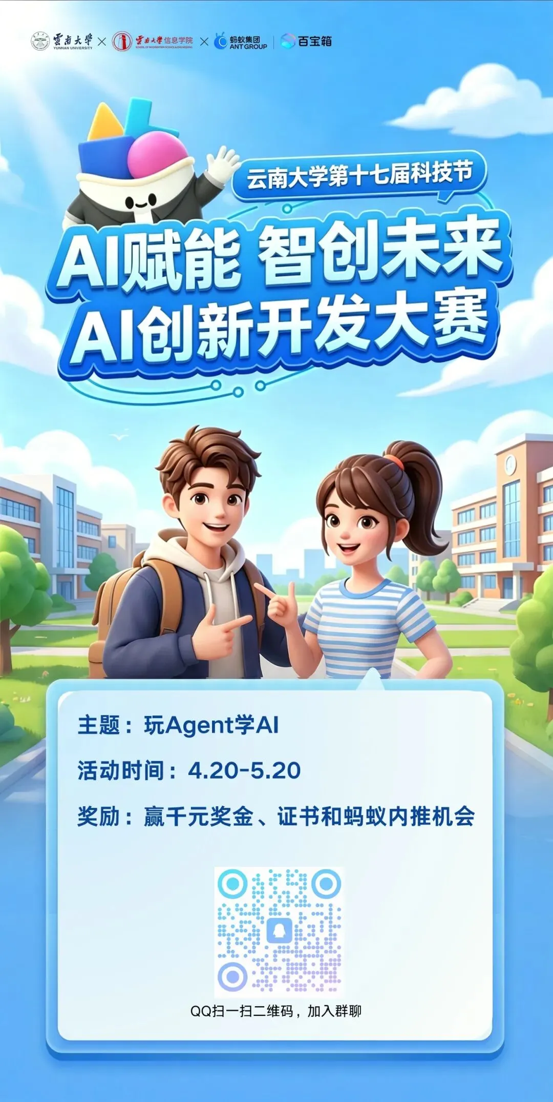 AI创新开发大赛聚焦智能体(Agent)与技能(Skill)技术在校园真实场景中的应用,鼓励同学们围绕校园服务、社交娱乐、社会公益、实用工具等方向,开展AI创新设计与开发实践。