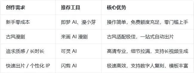 主打新手零门槛、零成本,操作极简,不用懂绘画、不用学剪辑,适合完全没基础的新手快速入门,轻松生成第一支 AI 漫剧。零成本使用:免费额度充足,日常创作完全够用,不用额外付费就能解锁基础功能。操作极简:输入简单创意描述,AI 自动完成角色、场景、配乐全流程,3 分钟就能出片。新手适配:内置新手引导,模板丰富,一键套用就能生成合格漫剧,不用摸索操作。