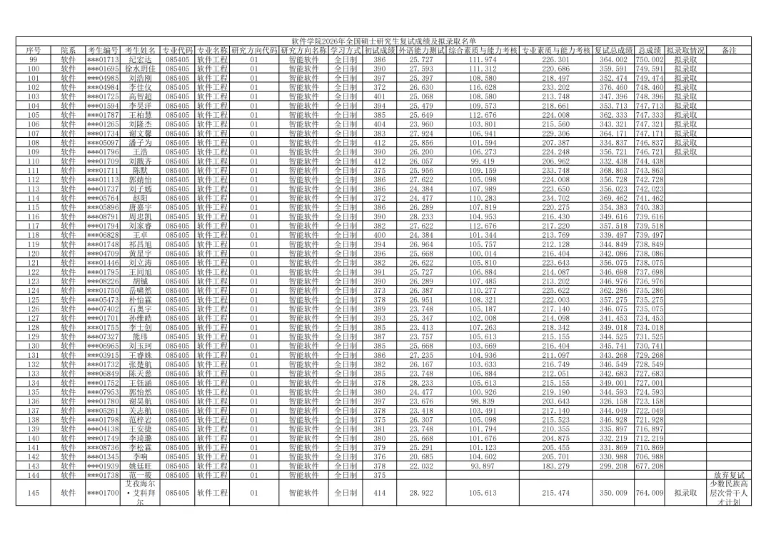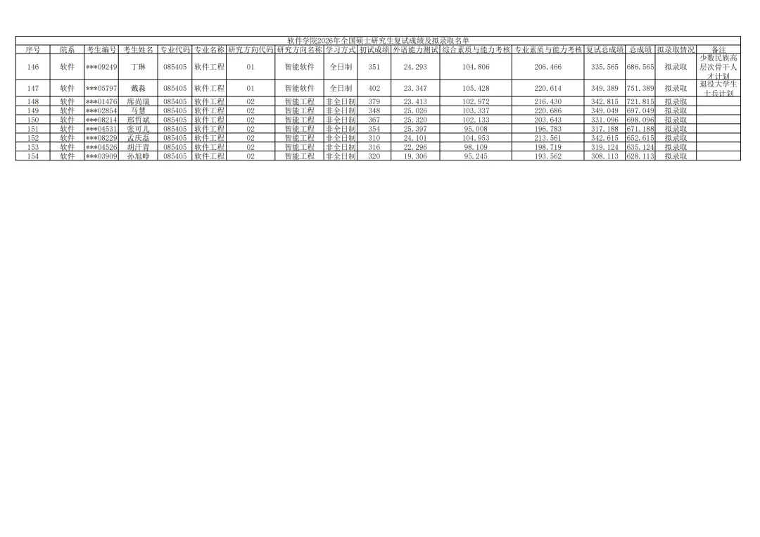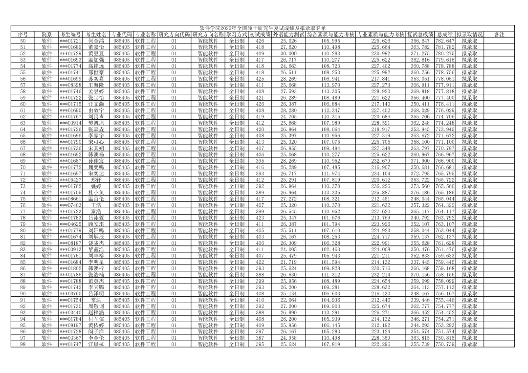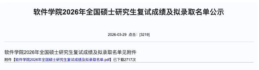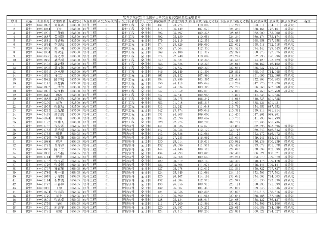 大连理工大学软件学院公示2026年全国硕士研究生复试成绩及拟录取名单声明:以下数据来源大连理工大学,如有侵权,请联系删除!2026年3月29日,大连理工大学软件学院在其官方网站上发布了"软件学院2026年全国硕士研究生复试成绩及拟录取结果公示"的通知,通知原文网址:https://ss.dlut.edu.cn/info/1321/31592.htm2026年硕士研究生复试成绩及拟录取名单: