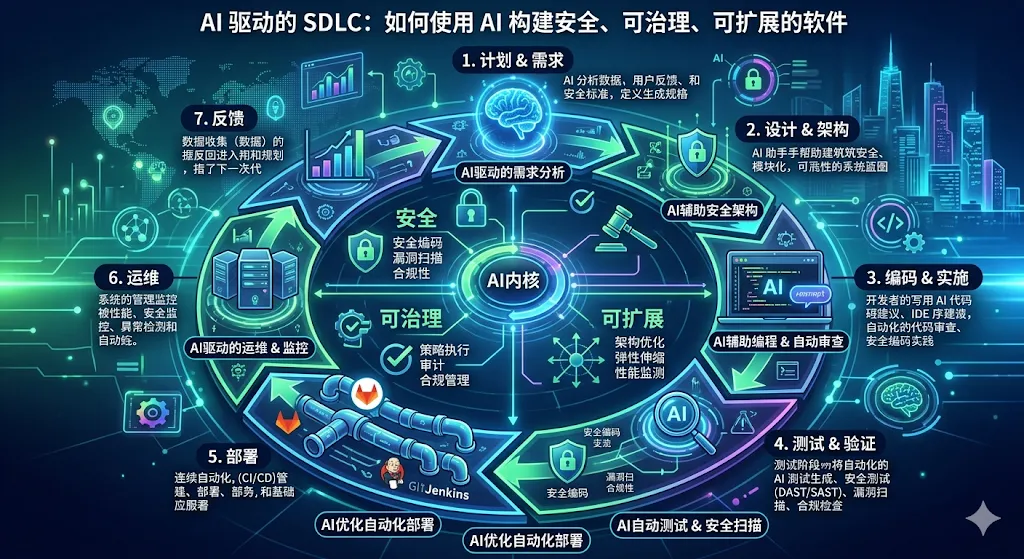 在这些阶段中,AI 支持规划、架构、编码、测试、安全验证和事件响应,同时提供大规模分析和持续反馈。这些能力共同减少了手动开销,加速交付,并在不牺牲控制的情况下提高质量。