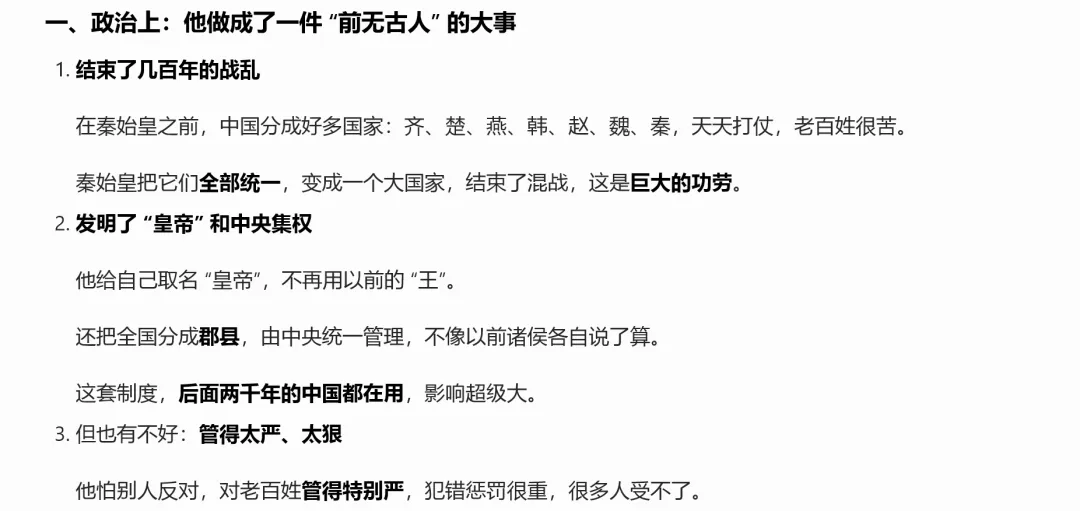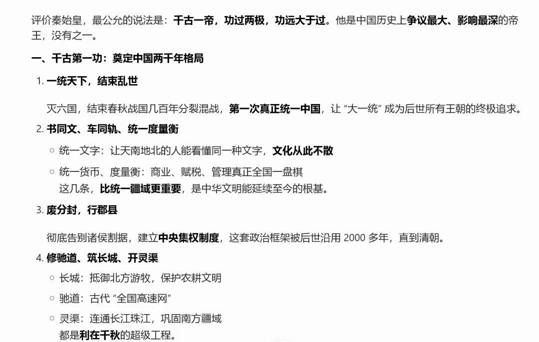 提问方式二:你是一名历史学教授,专门研究先秦两汉时期的历史,请从政治,经济,文化等主要领域,现在需要给一群8-10岁的小学生进行讲座,学生具有基本的历史框架认知,讲授主题是“评价秦始皇”