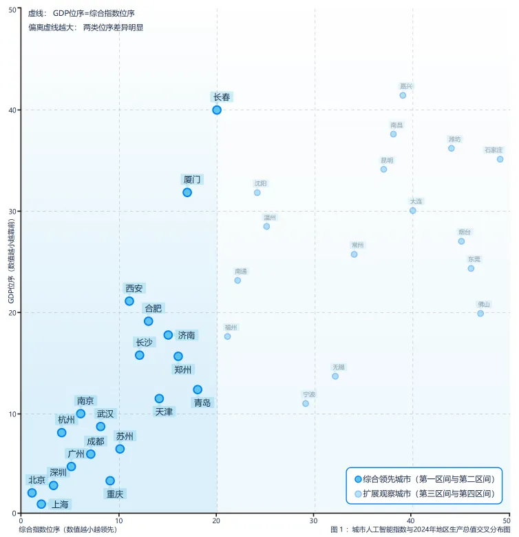 报告中有一张很有意思的图——把城市AI指数和GDP排名放在一起看。结果很清楚:城市AI综合发展水平与经济规模保持较强协同性,但注意这个"但"——城市之间仍存在明显结构分化。