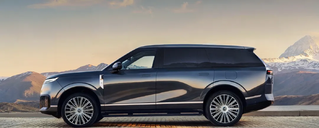 侧面:悬浮式车顶+隐藏式门把手,搭配21/22英寸多辐轮毂(可选22英寸鸳鸯胎),四门电动吸合+智能开合,上下车优雅便捷。