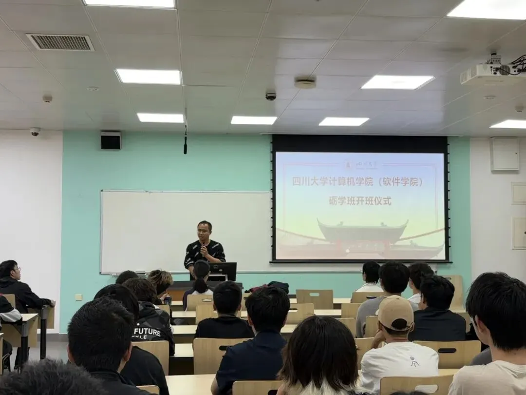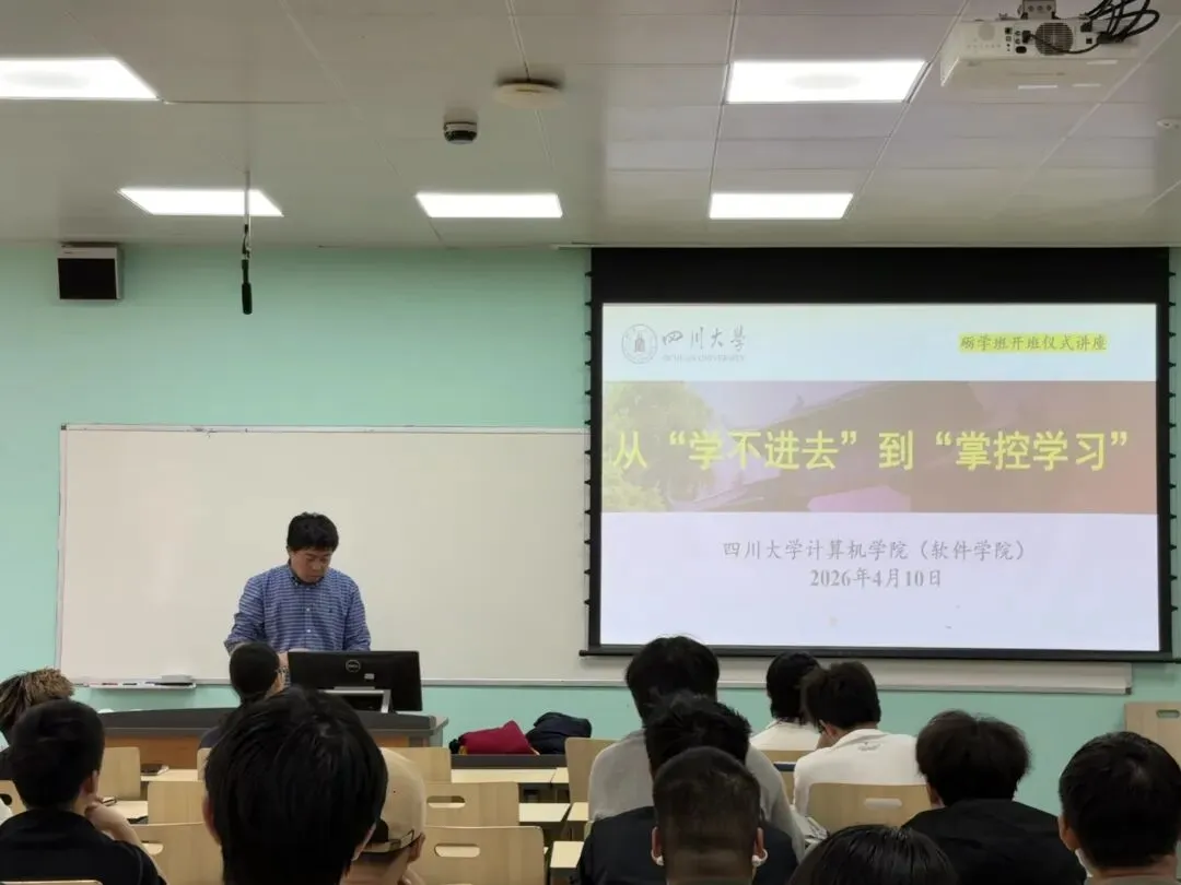 2026年4月10日下午16:00,四川大学计算机学院(软件学院)2024级“砺学班”开班典礼在江安校区第一教学楼A座311教室顺利举行。学院党委副书记黎红友,2024级本科生辅导员王俊普、韩云祥、耿天玉,“砺学班”朋辈导师罗旭威、彭昶玮、邓周愉、黄湘淇,以及入选“砺学班”的40余名同学共同参加了本次活动。