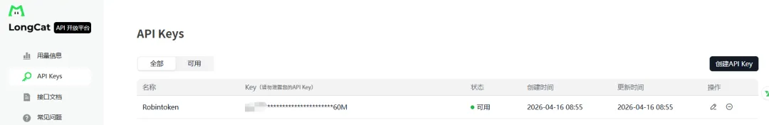 去 LongCat 注册 → 拿到 API Key