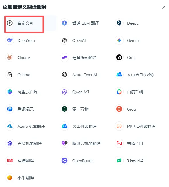 在设置页面找到 「翻译服务」 → 「添加自定义翻译服务」 → 选择 「自定义 AI」。