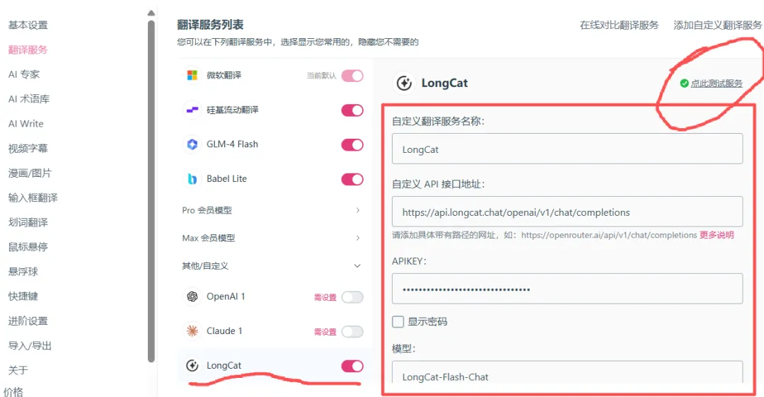 第二步:把 LongCat 配置进沉浸式翻译