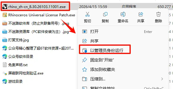 2.打开刚刚解压的文件夹,鼠标右键点击“rhino_zh-cn_8.30.26103.11001.exe”选择“以管理员身份运行”