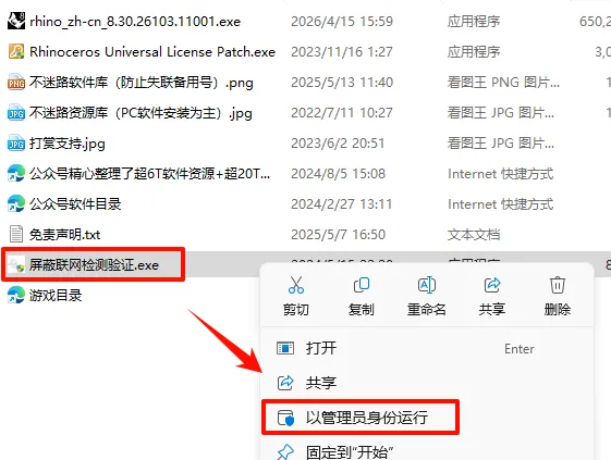 7.返回之前解压的“Rhino 8.30.26103.11001“文件夹,鼠标右键点击“屏蔽联网检测验证.exe”选择“以管理员身份运行”