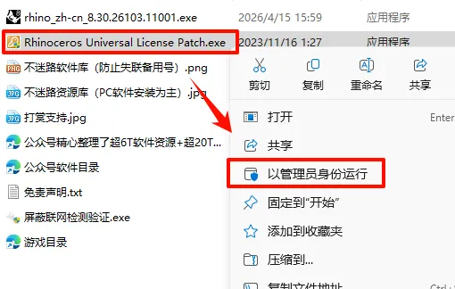8.鼠标右键点击“Rhinoceros Universal License Patch.exe”选择“以管理员身份运行”