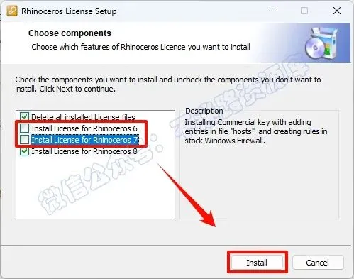 9.取消勾选“Rhinoceros 7和Rhinoceros 6”两项,点击“Install”