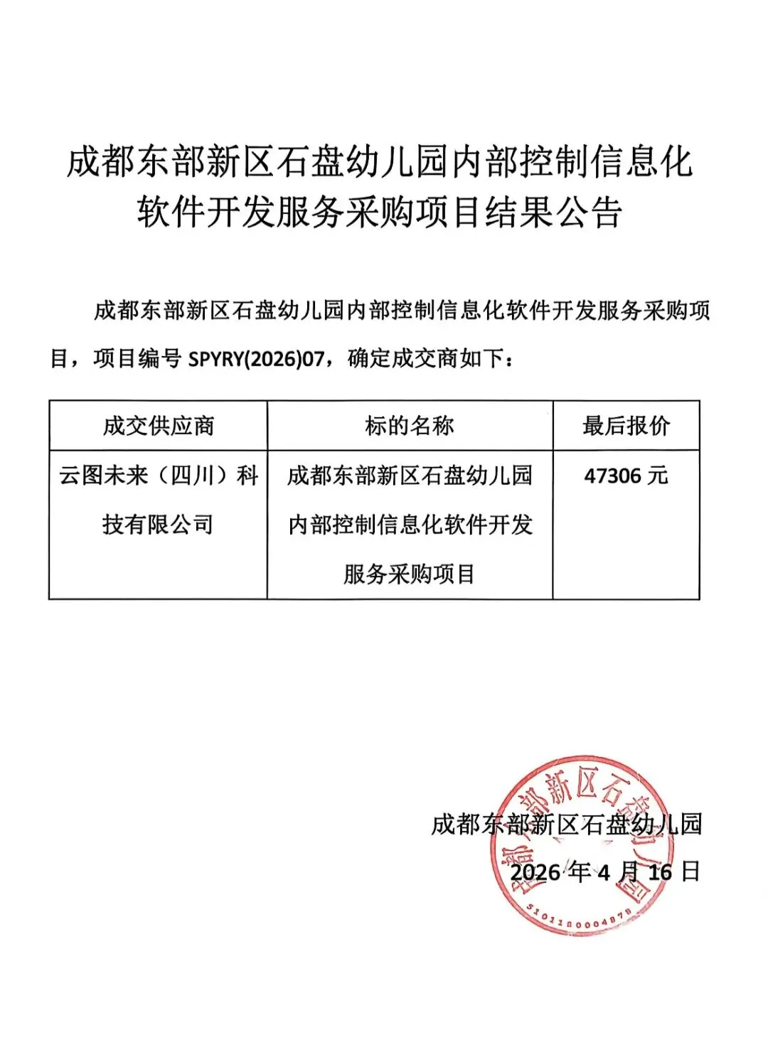 成都东部新区石盘幼儿园内部控制信息化软件开发服务采购项目结果公告