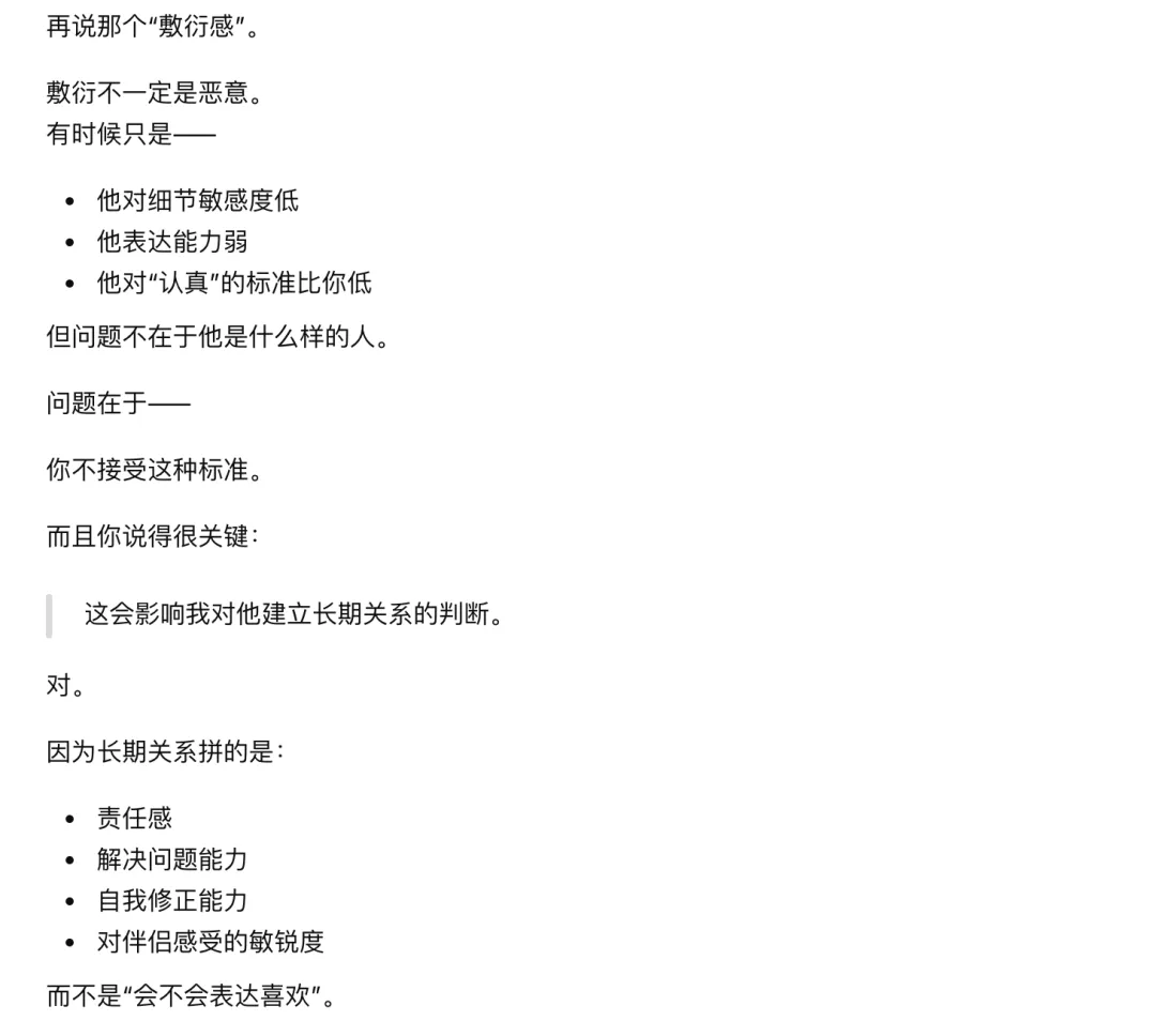 因为我跟AI说了 “ 我觉得是他在敷衍我,对我没有认真,更影响我对他的判断,比如:我不会跟这样的人在一起,或者是建立长久的关系 ” 这样的话。