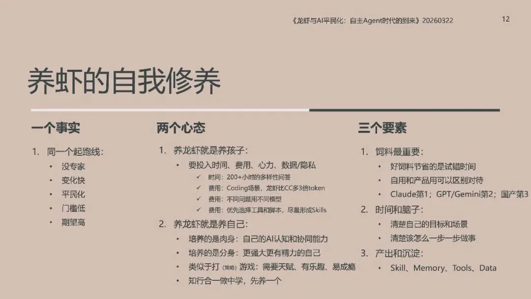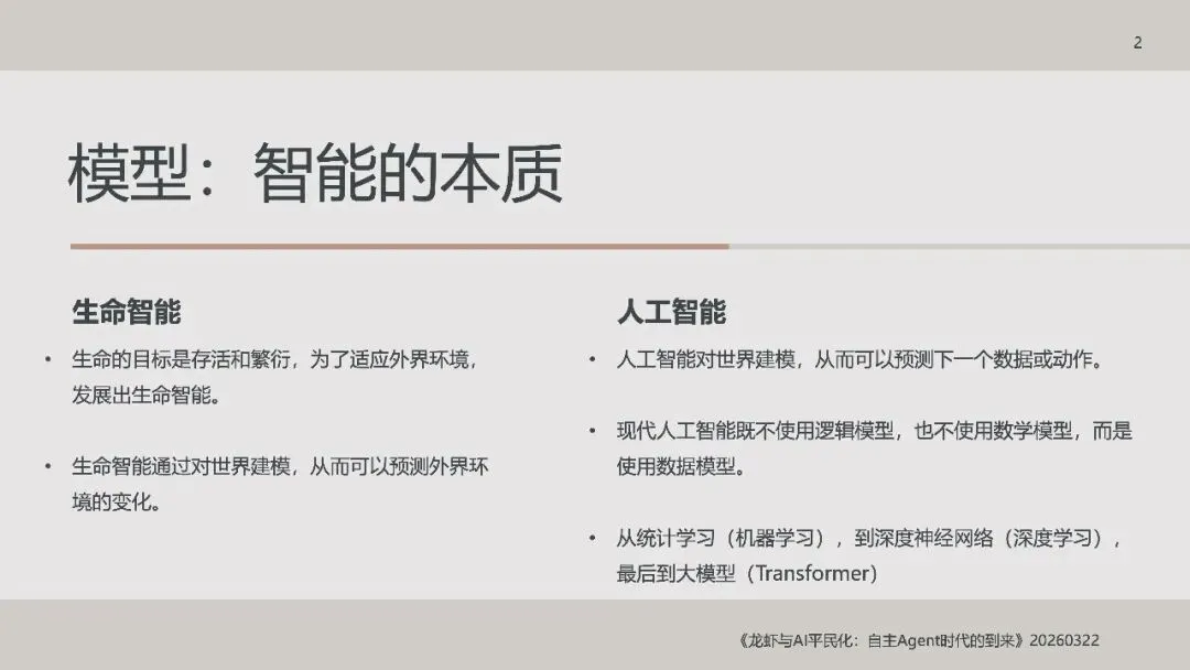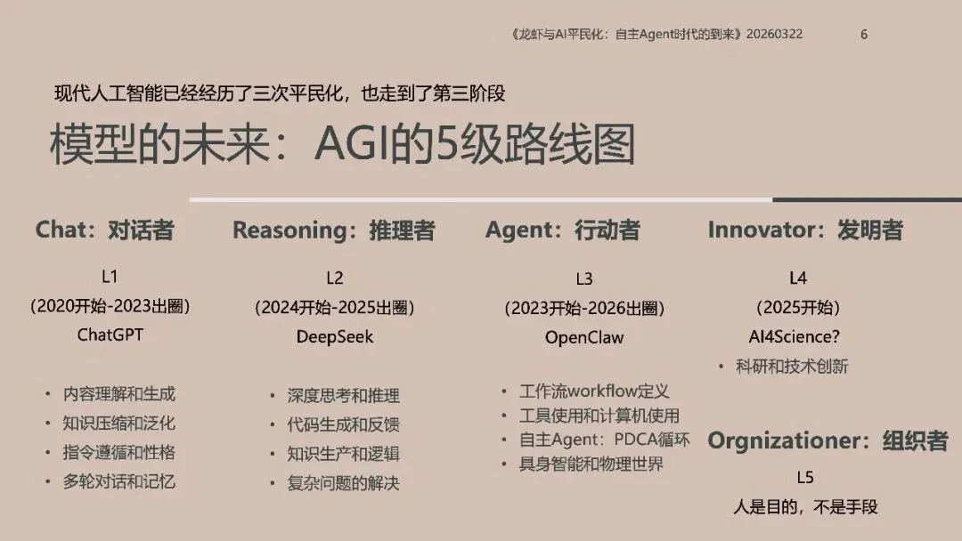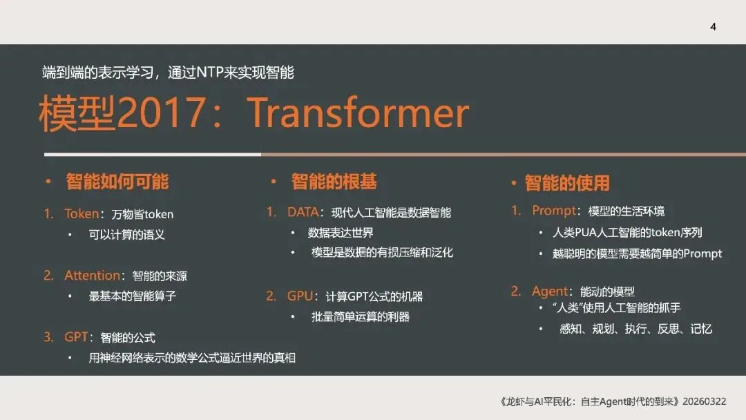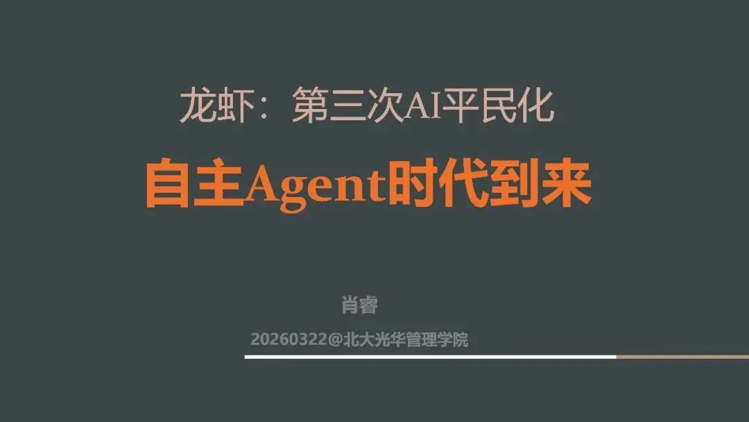 《龙虾:第三次AI平民化—自主Agent时代到来》这份北大光华2026年《龙虾:第三次AI平民化—自主Agent时代到来》报告指出,AI正进入以**自主Agent**为核心的第三次平民化阶段。 报告先梳理AI本质是数据建模与预测,依托Transformer的Token、Attention、GPT实现智能,以数据与GPU为基础,靠Prompt交互、Agent落地。AI演进分五级:对话、推理、自主Agent、创新、组织重构,2026年自主Agent迎来出圈。 自主Agent从非自主框架走向OpenClaw(龙虾)等自主范式,遵循感知-规划-执行-反思闭环,OpenClaw开源灵活、快速走红。报告以“养虾”比喻Agent使用,强调选模型、投入心力、沉淀技能工具。 智能系统是IT自动化、AI智能化与人的灵活性的组合,自主Agent将推动AI平权与生态爆发,重塑人机协作与组织形态。
