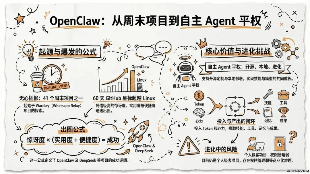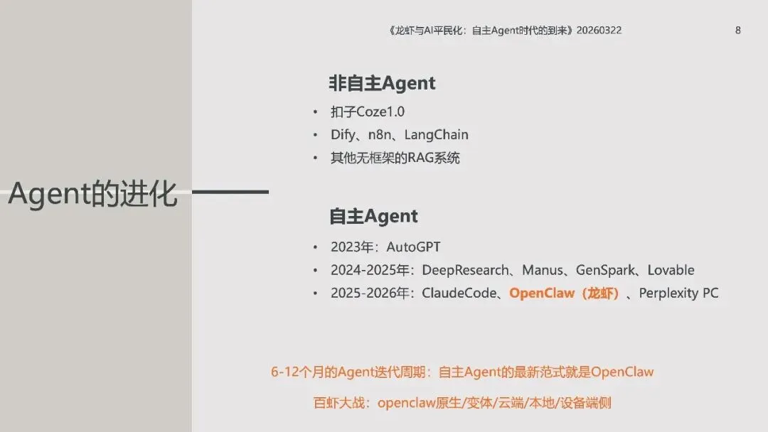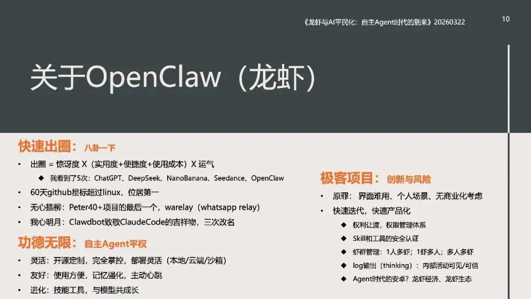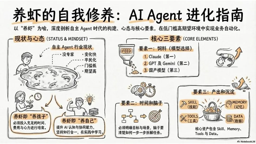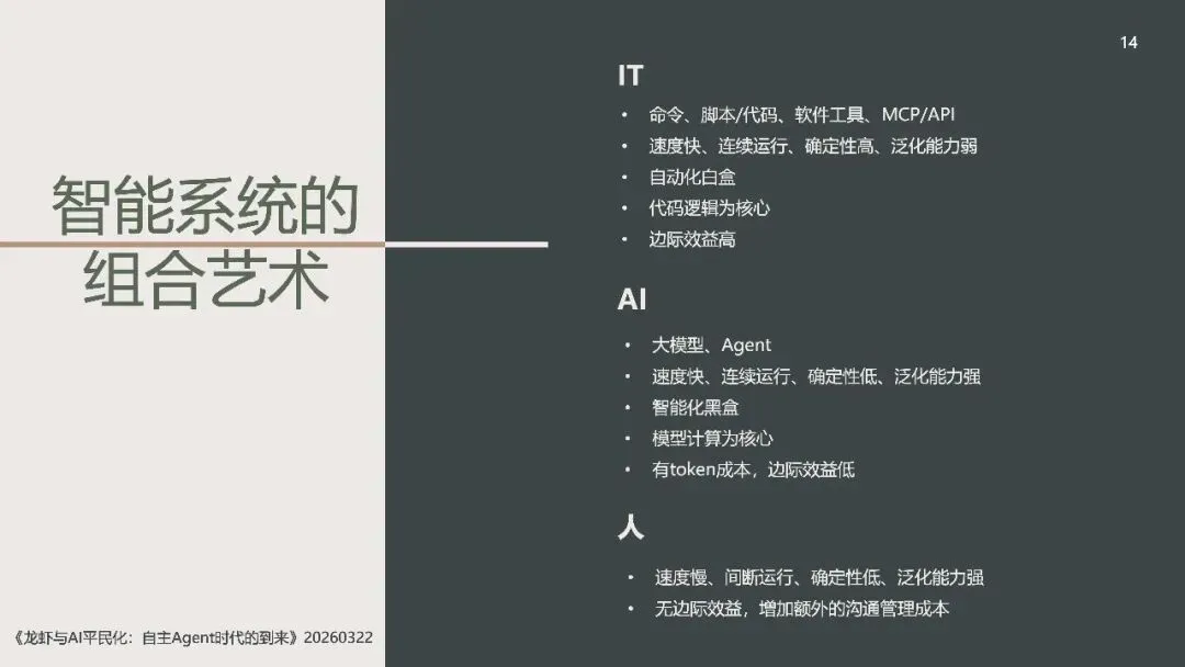 《龙虾:第三次AI平民化—自主Agent时代到来》这份北大光华2026年《龙虾:第三次AI平民化—自主Agent时代到来》报告指出,AI正进入以**自主Agent**为核心的第三次平民化阶段。 报告先梳理AI本质是数据建模与预测,依托Transformer的Token、Attention、GPT实现智能,以数据与GPU为基础,靠Prompt交互、Agent落地。AI演进分五级:对话、推理、自主Agent、创新、组织重构,2026年自主Agent迎来出圈。 自主Agent从非自主框架走向OpenClaw(龙虾)等自主范式,遵循感知-规划-执行-反思闭环,OpenClaw开源灵活、快速走红。报告以“养虾”比喻Agent使用,强调选模型、投入心力、沉淀技能工具。 智能系统是IT自动化、AI智能化与人的灵活性的组合,自主Agent将推动AI平权与生态爆发,重塑人机协作与组织形态。