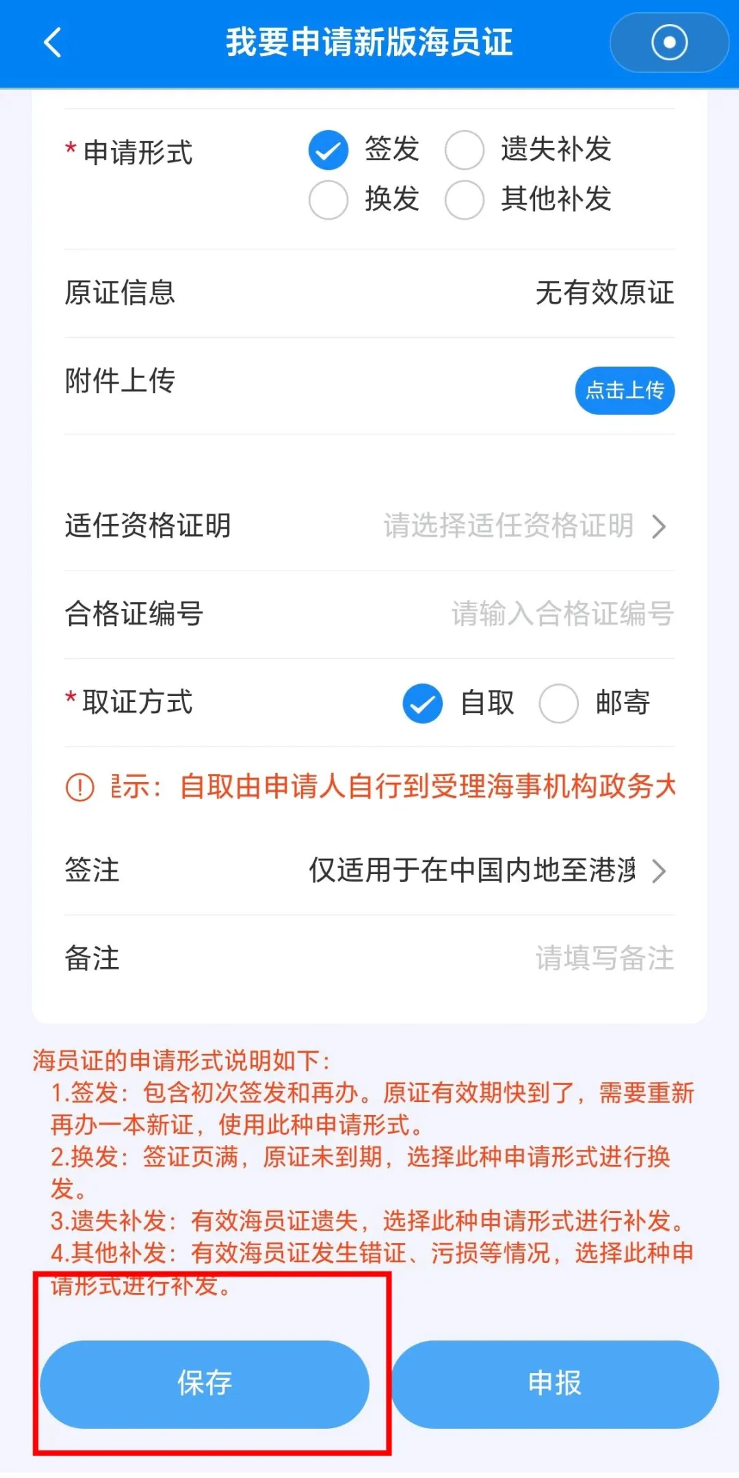 注意⚠️:海员证换证选择的申请形式是“签发”。“签发”包含初次签发和再办。“换发”指的是签证页满且原证未到期才是选择换发。