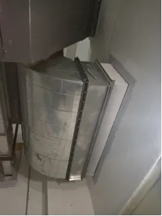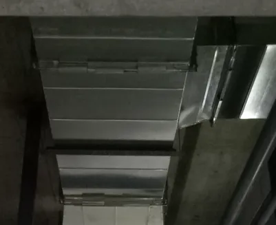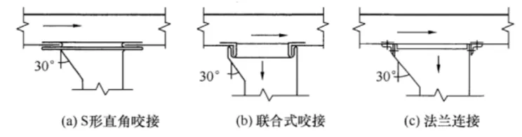 屋面风机出口应加45°弯头,弯头咬口应顺水流方向。圆风管制作不应出现十字接口。
