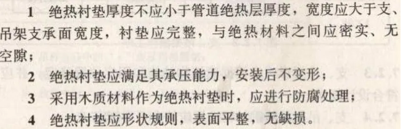 冷(热)水管道与支、吊架之间,应设置衬垫。衬垫的承压强度应满足管道全重,且应采用不燃与难燃硬质绝热材料或经防腐处理的木衬垫。衬垫的厚度不应小于绝热层厚度,宽度应大于等于支、吊架支承面的宽度。衬垫的表面应平整、上下两衬垫接合面的空隙应填实。