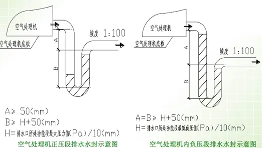 机组下部冷凝水排放管应引至指定的泄放地点(如:地漏),并设有水封,水封高度符合产品技术文件要求(一般应为10mm,根据厂家要求安装)。