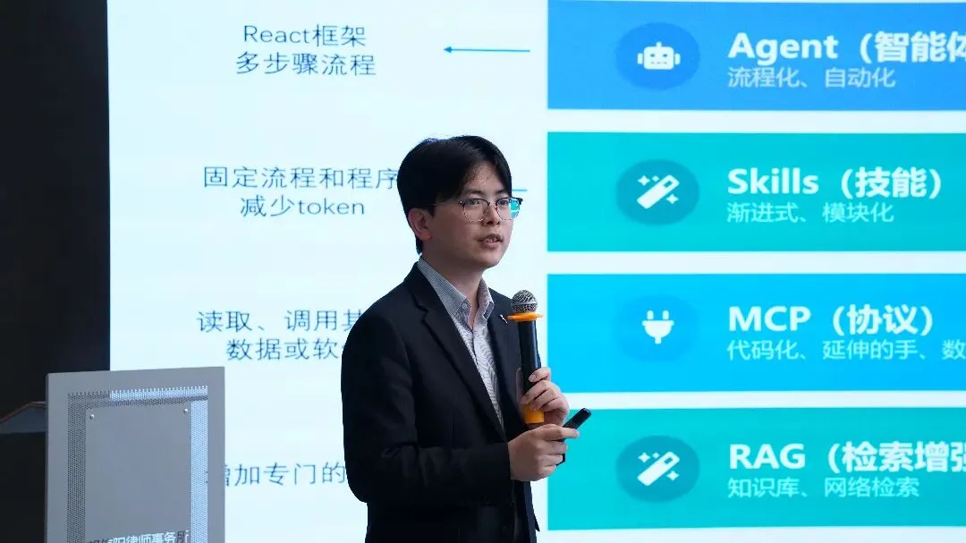 活动中,上海邦信阳律师事务所未来律师实验室主任韩欣律师以“律师业务的AI实现——底层原理与应用层次”为主题作专题分享。韩欣律师从“律师业务的黑箱”视角切入,深入剖析了法律技术与AI技术相互交织的复杂性,围绕大模型的模态原理、提示词工程、RAG(检索增强生成)、MCP(模型上下文协议)、Agent(智能体)等核心技术概念进行了系统讲解,并结合法律业务场景,重点回应了“幻觉”应对、隐私保护、性价比平衡等律师普遍关注的现实问题。