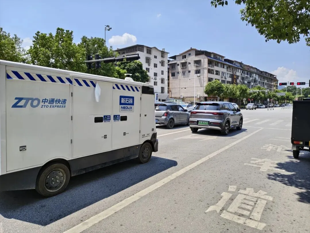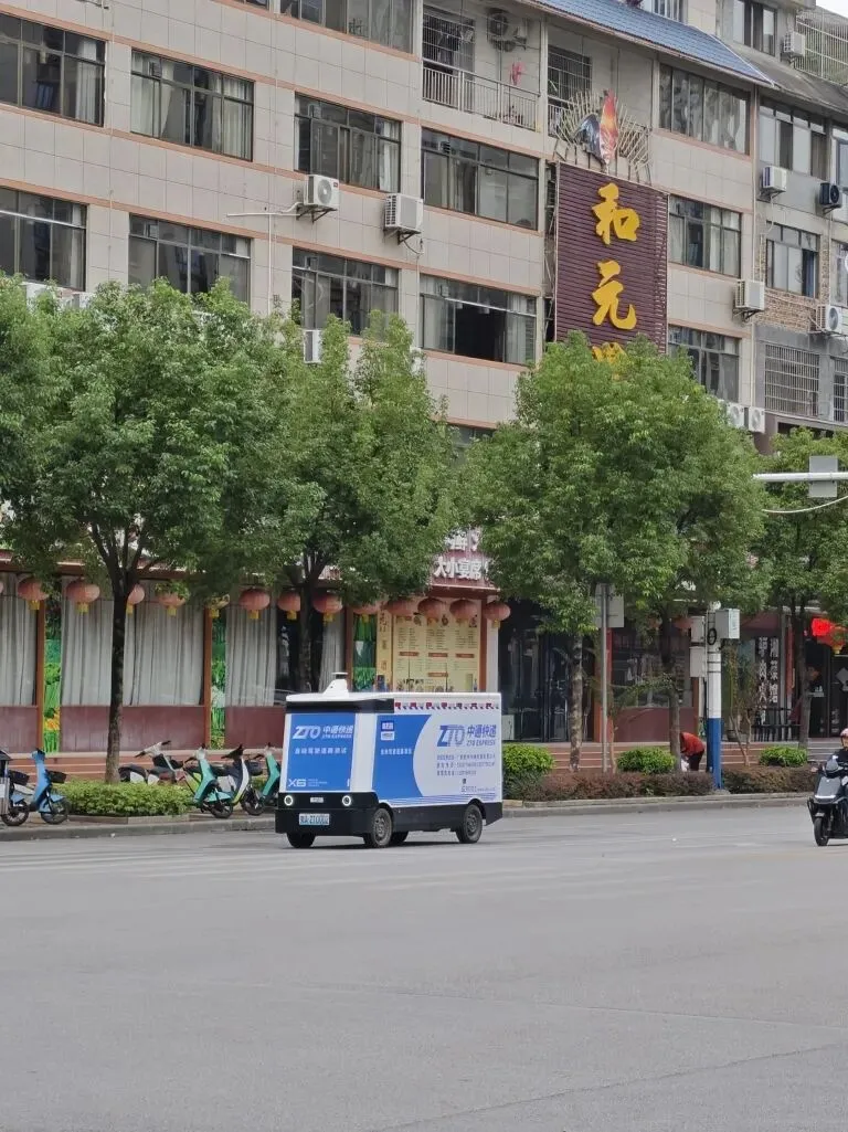 无人快递车行驶在城区街道上。