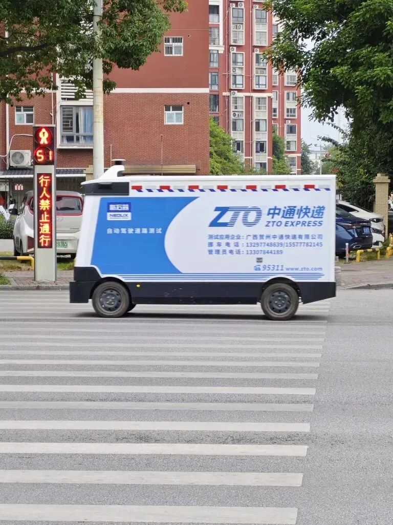 每天上午9点,贺州市中通快递有限公司的处理中心一派繁忙景象。自动分拣机传送带高速运转,将来自各地的包裹送到人工分拣流水线,分拣完毕的包裹不再像以往那样等待大型货车满载后再运输,而是被直接码放进形似小型集装箱的车辆内。无人车管理员李振纯核对完信息,在手机APP上轻轻一点,车辆便马上响应启动,自动驶出仓库大门,汇入晨光中的车流,按照提前设定好的路线,精准地驶向快递驿站。车顶的激光雷达缓缓旋转,它们在路口自动减速,遇到行人礼让停下。