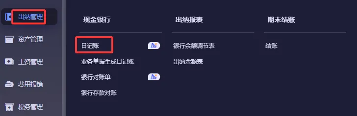 1. 打开金蝶AI星辰,在菜单栏找到【出纳管理】,点击进入【日记账】页面;