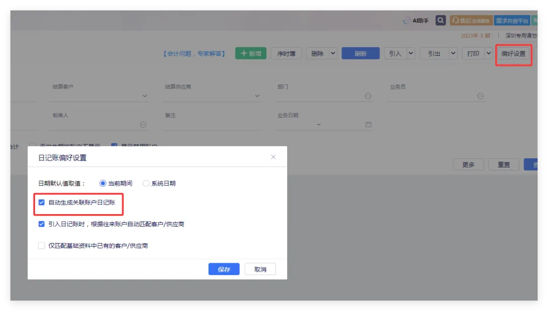 2. 找到页面右上角的「偏好设置」,点击进入后,勾选【自动生成关联账户日记账】,记得点击保存;