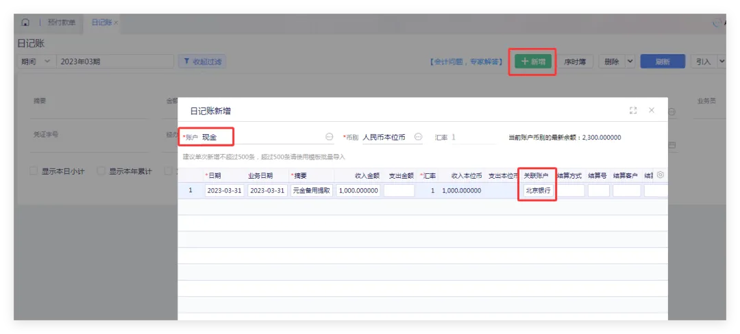 1. 新增日记账时,选择「现金账户」作为登记账户,关联账户选择需要取现的「银行存款账户」;