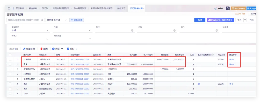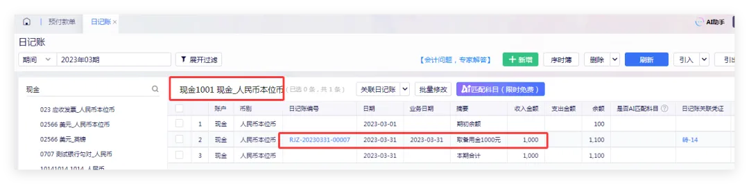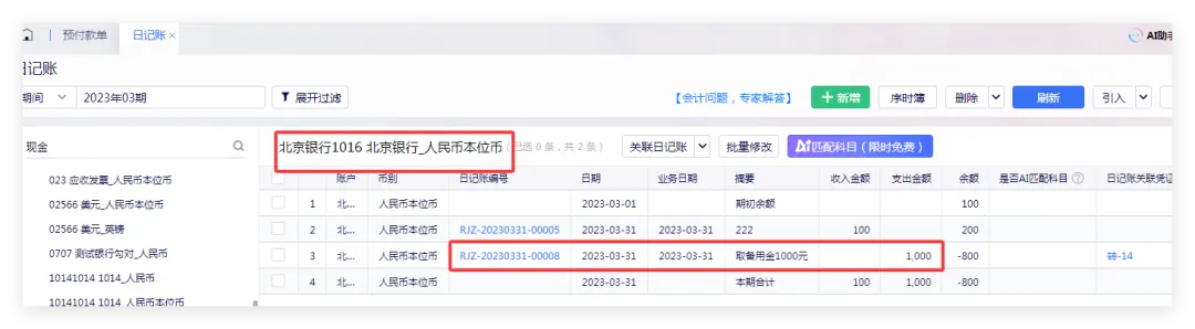 - 同时,关联的银行存款账户,会自动生成一笔对应的「支出」日记账(对应取现支出);