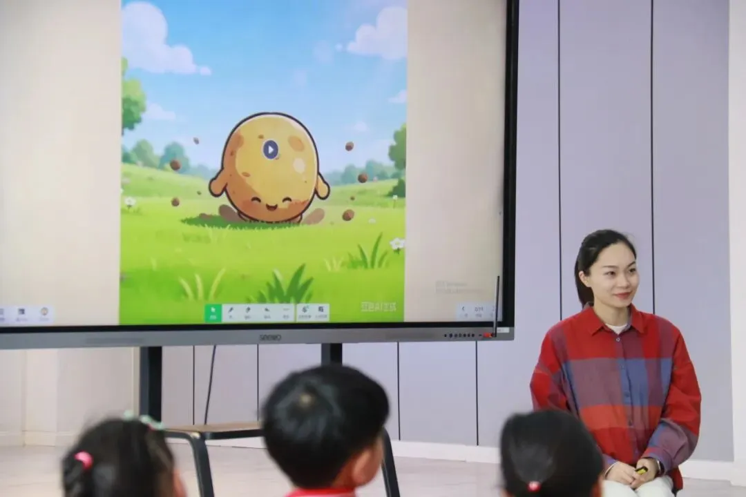 怎样让土豆滚得更远?吴老师创设了“土豆滚滚”的有趣情境,小土豆的AI动画形象贯穿全程,通过视频提问引导幼儿发现“坡度越高滚得越远,但太陡反而会弹跳变近”的物理小秘密,让抽象的力学规律变得直观又生动。
