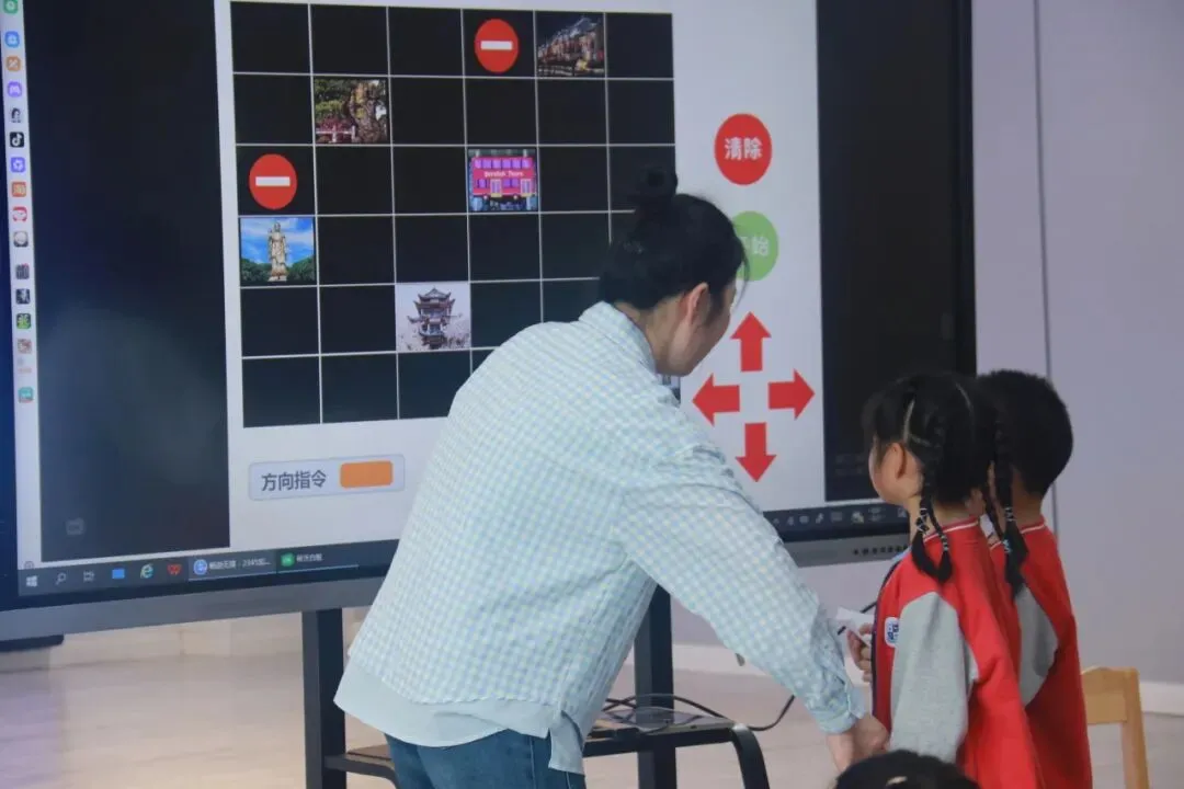 金老师以“无人驾驶汽车游无锡”为主线,引导幼儿合作绘制箭头指令卡,并在Scratch汽车模拟器上验证运行。AI技术让编程思维可视化,也让幼儿直观感受到“指令越少,用时越短”的最优路线原理,在游戏中萌发对家乡的热爱。