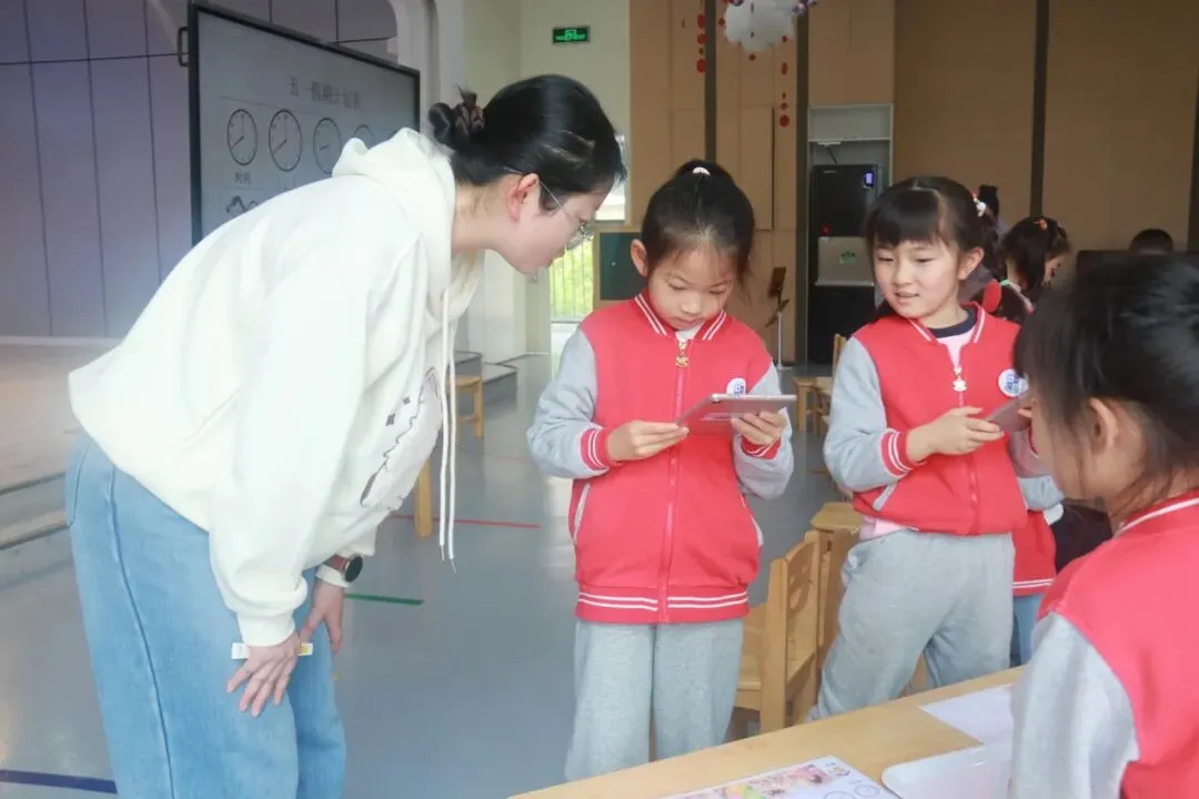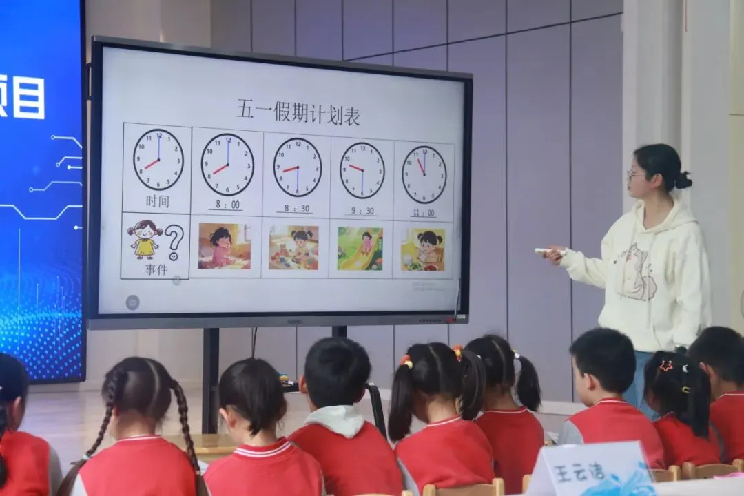 郭老师和幼儿一起为即将到来的五一假期制定计划表,根据钟面上的整点与半点匹配正确的时间与活动事件。幼儿完成后可以拍照上传豆包AI进行自动批改,并请豆包评价计划的合理性。人机互动式的自主检查,帮助幼儿初步形成时间管理与自我纠错的好习惯。
