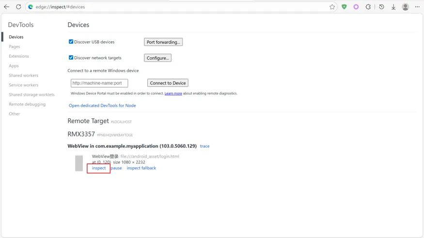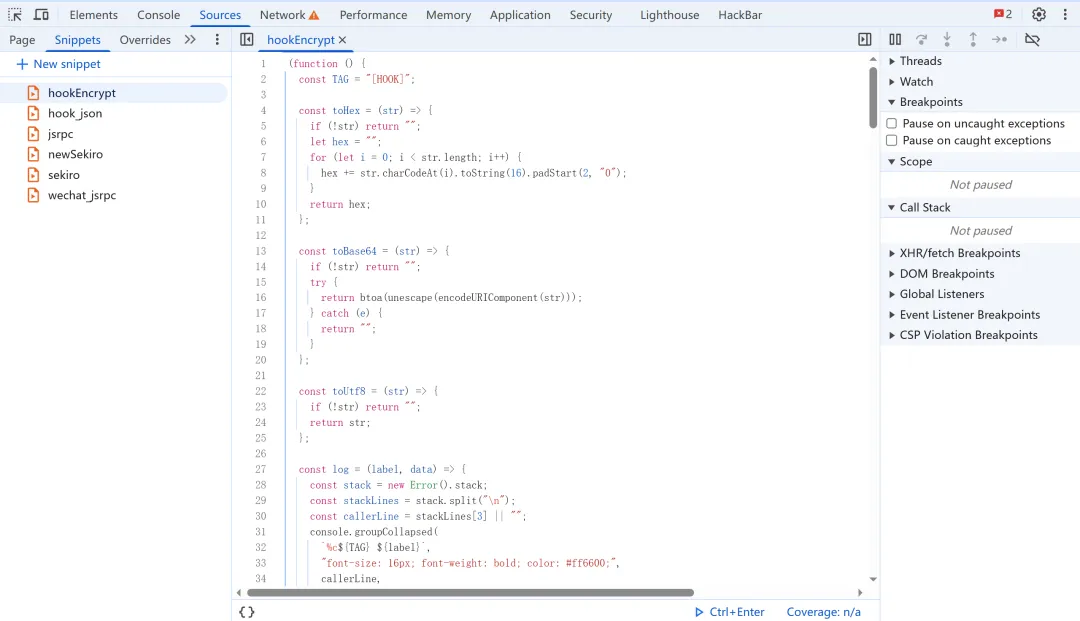 在android原生开发的功能中,当我们碰见加密,我们可以用frida hook java代码、算法助手来弄清楚他的加密逻辑。 如果在Webview中碰见加密,我们可以像调试传统web网站一样对webview中的js文件进行调试。 在调试webview中的js之前,我们需要有对app中webview的调试权,这需要WebView.setWebContentsDebuggingEnabled(true); 然而市面上的app一般不会给我们这个调试权限,所以我们需要通过以下项目打开webview的调试权限。项目地址:https://github.com/feix760/WebViewDebugHook【PS】:apk在项目的/app/release目录下将apk下载下来装入lsposed中,在lsposed中启用该模块并勾选目标app 接下来手机连接数据线到电脑,确保adb能获取到设备信息,然后打开app中的webview页面,在edge浏览器中输入edge://inspect进入如下页面 等待一会儿,就会显示检测到的webview页面,点击inspect即可进入webview的调试页面 由于是另起了一个窗口,所以我们用不了浏览器自带的插件,那我们有什么快捷的方法进行解密吗?我们可以在Snippets里面写入Hook AES、RSA等加密的js代码 这些hook加解密的js代码我们可以通过油猴、插件、Github来获取。可以参考:https://www.cnblogs.com/yoyo1216/p/19186628 当然有时候并不需要这么麻烦,有些webview界面相关的数据包可能会有路由,我们拖到浏览器可以直接去访问进行解密。【PS】:如果要使用chrome浏览器进行调试,则在浏览器中输入chrome://inspect,使用chrome浏览器时需要打开科学上网,不然后面会提示404而无法成功调试。 05