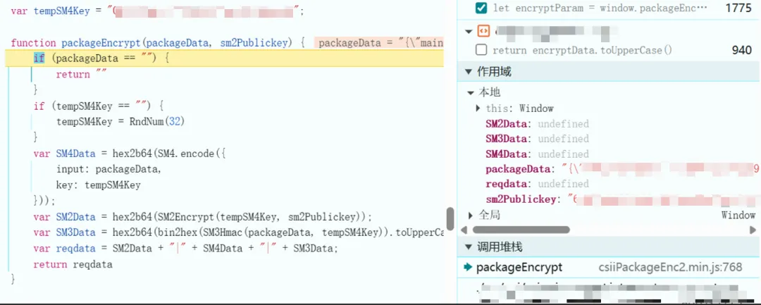这种全加密的我们只能全局搜索关键词encrypt:、encrypt(,或者打xhr断点,通过一步步调试找到加密位置,可以看到很明显的SM2、SM4加密逻辑还有SM3验签。