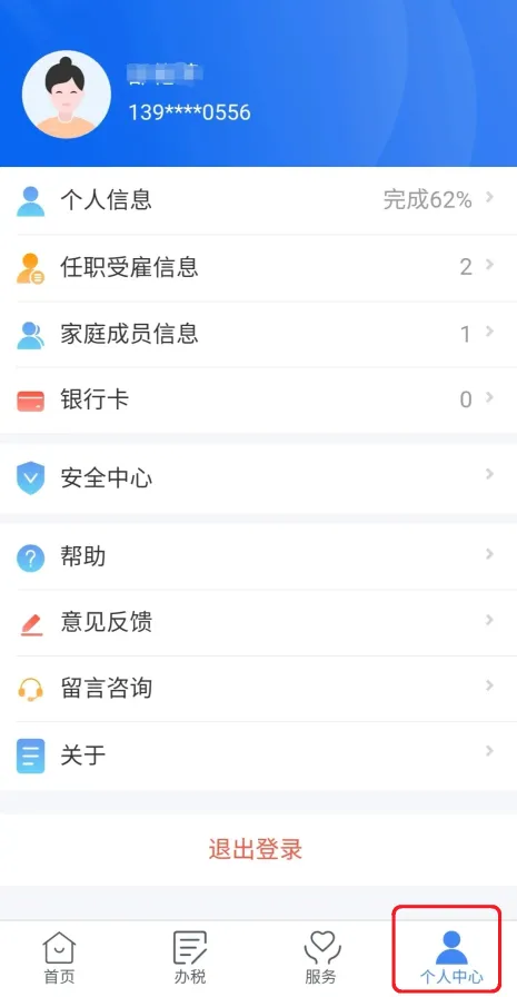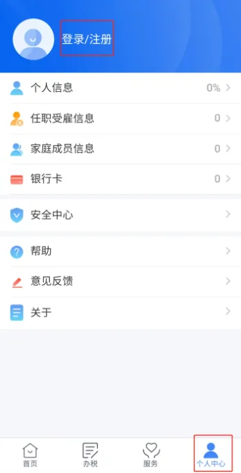 下载安装个人所得税APP后,进入个税APP,点击【个人中心】—【登录/注册】,开始注册。