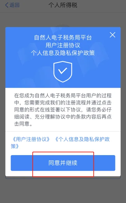 点击【注册】后选择【人脸识别认证注册】,仔细阅读“自然人办税服务平台用户注册协议”后点击【同意并继续】。