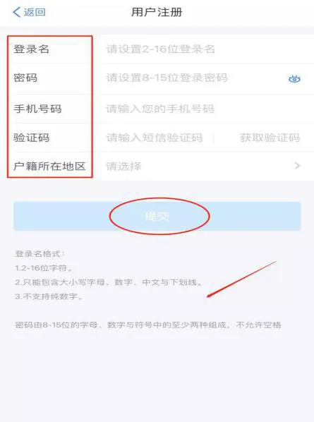 进入【人脸识别认证注册】,正确填写“居民身份证”【证件号码】与【姓名】信息,点击【开始人脸识别】。完成人脸识别后按要求输入相关信息(包括登录名、密码、手机号(短信校验)、户籍所在地等),填写完成点击【提交】。