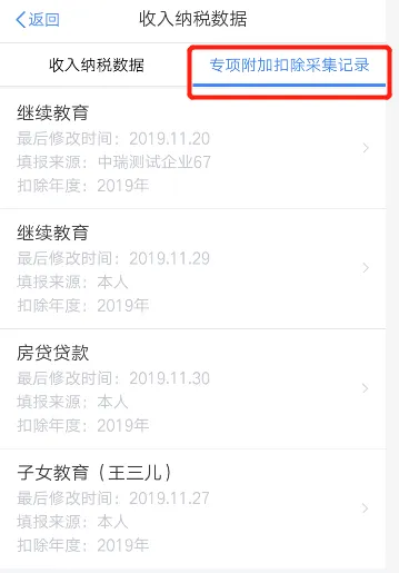 纳税人进入自行申报页面,可点击“查看收入纳税数据”,点击展示“专项附加扣除采集记录”,如下图: