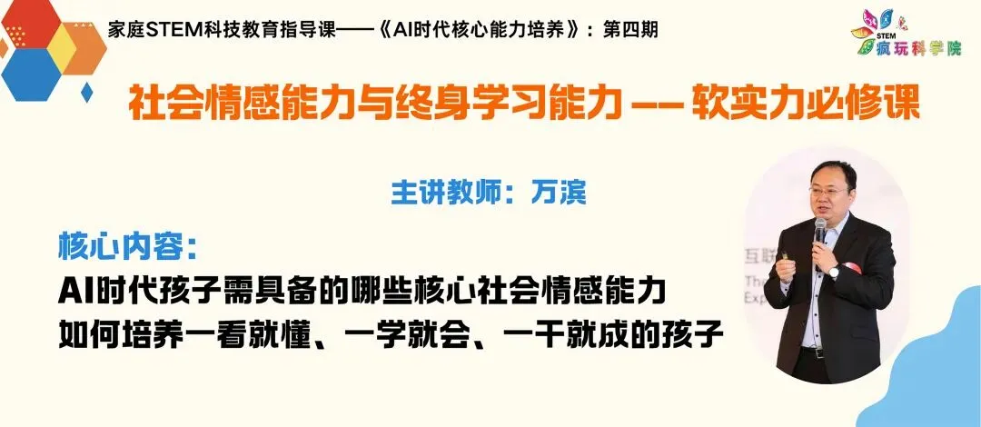 为切实助力广大家长破解AI时代家庭科技教育困惑,精准把握教育发展机遇,科学规划孩子成长路径,疯玩科学院资深 STEM 超学科教育独立学者万滨老师,开展「家庭 STEM 科技教育指导课」专题第四课:《社会情感能力与终身学习能力——软实力必修课》。