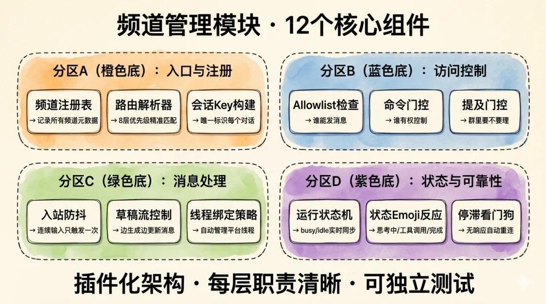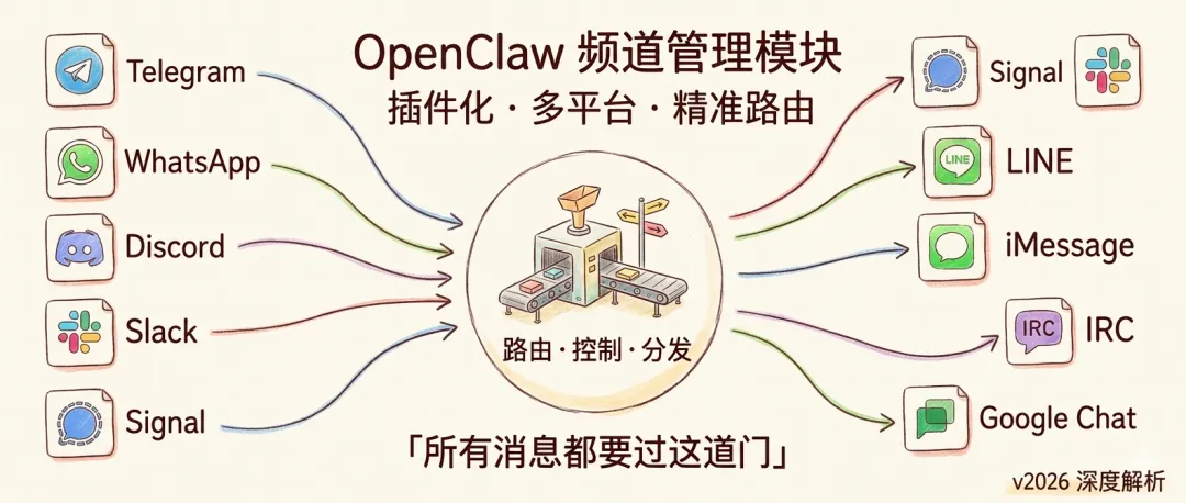 频道管理模块是 OpenClaw 的多平台消息入口层,负责接收、路由和发送消息到多个即时通讯平台。该模块采用插件化架构,支持内置频道(Telegram、Discord、Slack、Signal等)和扩展频道(Teams、Matrix、Zalo等)。