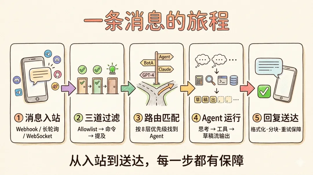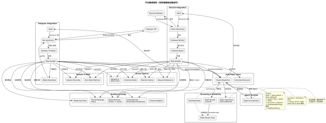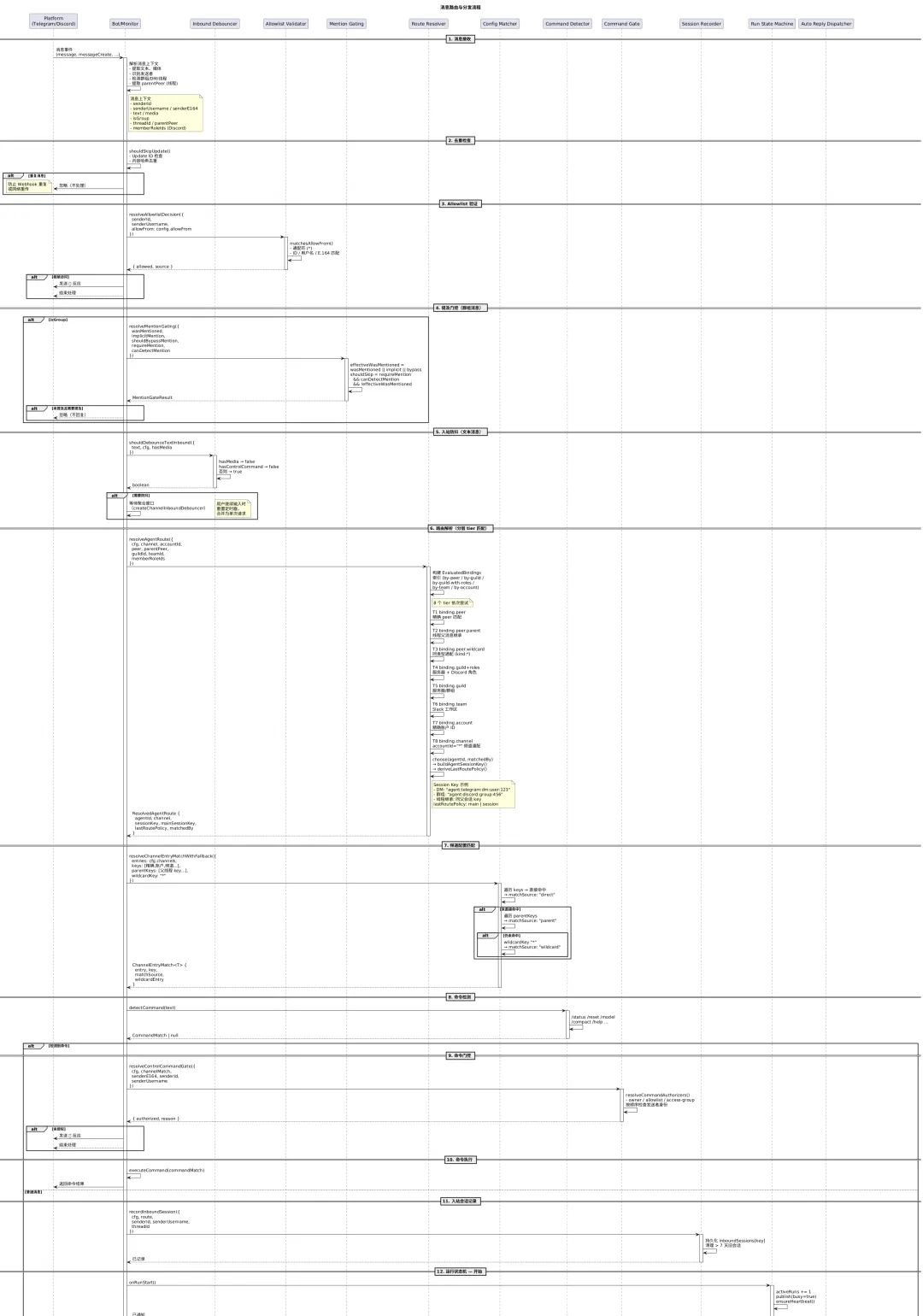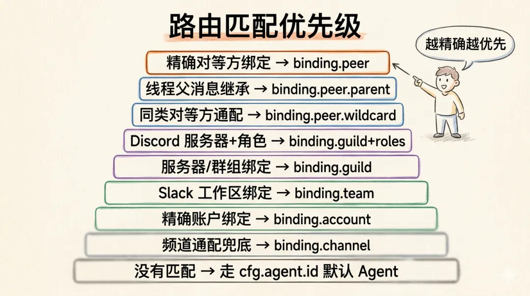 - • 路由决策: 根据频道、账户、对话、群组匹配 Agent 路由