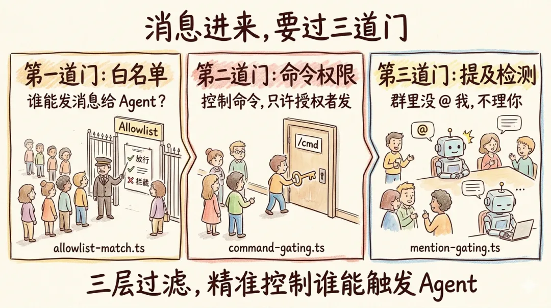 - • 访问控制: Allowlist 验证、命令门控、提及检测